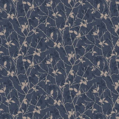 A light fabric effect wallcovering with layers of trailing leaves and branches - embossed with flat copper metallic detail too.