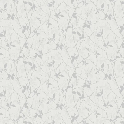 A light fabric effect wallcovering with layers of trailing leaves and branches - embossed with flat silver metallic detail too.