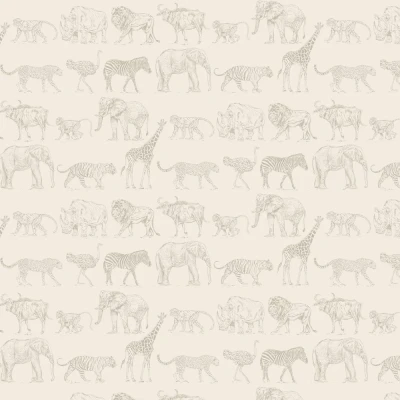 A playful safari design featuring metallic highlights of exotic animals including zebra, lions, monkeys and elephants on a cream background. Make a statement in any room with this contemporary design. Shown here in the cream colourway.