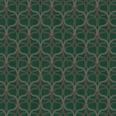 A light textured vinyl wallcovering with layers of geometric trellis and overall distressed effect. Shown in the Green colourway with metallic highlights.