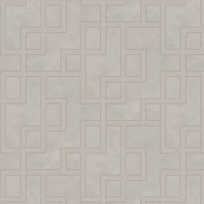 A lightly textured vinyl wallcoverings with a faux polished concrete design over laid with a geometric Greek key pattern with metallic highlights. Shown in the Pearl colourway.