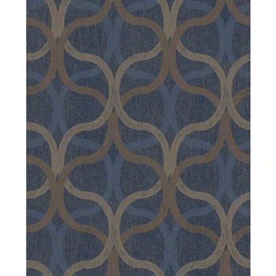 WallpaperDirectA light textured vinyl wallcovering with layers of geometric trellis and overall distressed effect. Shown in the Navy colourway with metallic highlights.