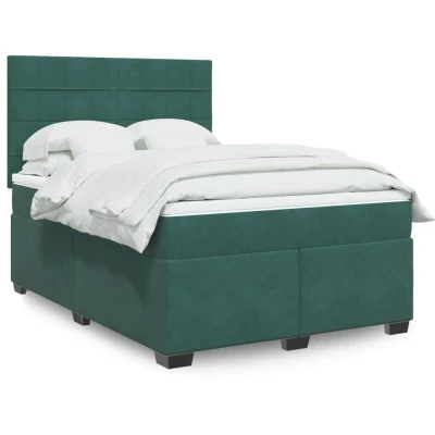 ManoManoGeneral description Use this box spring bed to enjoy a restful night's sleep! It offers you maximum relaxation and pleasant sleep. The bed features a soft and comfortable velvet fabric that provides a delightful sensation against the skin, ensuring warmth and ultimate comfort. The pocket spring mattress is designed with individual pocket springs that work independently to provide personalized support, preventing "roll-together" and reducing motion transfer. Technical specifications Bed frame with headboard: Colour: Dark green Material: Velvet (100% polyester), plywood, engineered wood Dimensions: 190 x 144 x 140.5/150.5 cm (L x W x H) Thickened plastic feet Solid pine wood supporting feet Assembly required: Yes Mattress: Colour: White and dark green Material: Velvet (100% polyester) Filling material: Pocket springs, foam Firmness: Medium Dimensions: 140 x 190 x 20 cm (W x L x H) Mattress topper: Colour: White Material: Fabric (100% polyester) Filling material: Foam Dimensions: 140 x