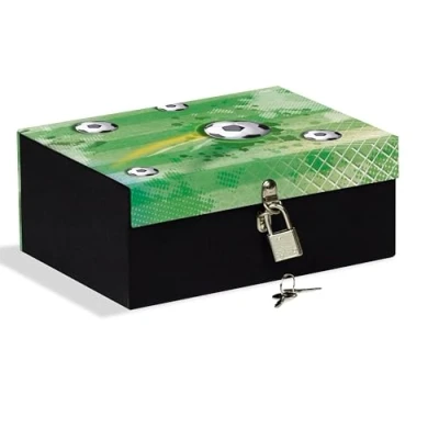 Secret box with padlock cm 18.5x14x7.5 in printed paper with plastic finish and plain coated paper base The box is closed with a metal lock and 2 keys The box can hold jewelry, playing cards, pens and pencils, figurines, etc. Clear cellophane packaging Made in Italy with Italian materials