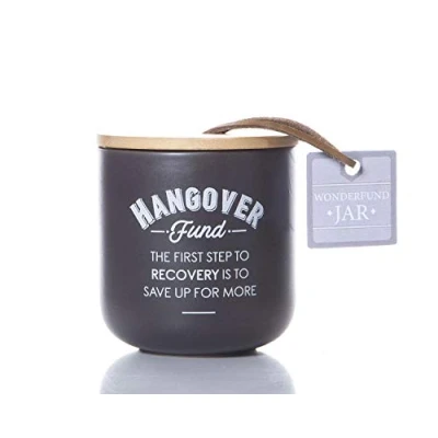 HILARIOUS HANGOVER FINE JAR - Fund the recovery of a horrible hangover with this hilarious novelty money saver Jar Fine yourself or friends and family everytime they're hungover and you'll be able to afford some paracetemol in no time STYLISH AND HIGH QUALITY - This high quality ceramic jar with solid wooden lid is an affordable yet classy take on traditional money tins and boxes. Sturdy and modern, with a minimalist look, this is the ultimate gift for fun-loving friends and family FUNNY SENTIMENT - Stylish white text reads “Hangover Fund – The First Step To Recovery Is To Save Up For More”, giving this classy ceramic pot a humorous twist THE PERFECT SECRET SANTA GIFT - Complete with attractive gift tag (held on with a high quality leather strap), this novelty money jar is the perfect gift for booze loving friends and students on their Birthday, or at Christmas as a Secret Santa gift