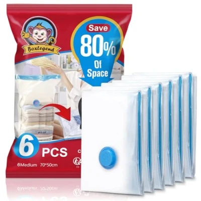 [6 Medium Bags] The Compression Sealer Bags include 6 Medium compression bags (70 x 50cm) for storing your duvets, blankets, pillows or clothes for different seasons. They are great helpers for your storage, traveling and home moving. [Save 3-8X Space] The 6 vacuum storage bags sets help you save 30%- 80% of storage space. You will get more storage place for your suitcase, closets, basements, lofts and garages. [Great Airtight Effect] The Double-Zip Seal and Triple-Seal Turbo Valve can better avoid air from getting in again, keeping long-term vacuum effect. [Thickened Material] These airtight bags are made of PA+PE material and the thickness of the vacuum bags is increased to 80 microns instead of 70 microns, prevent air leakage and will not tear when squeezed. [Protect Clothing] With our vacuum bags, the textiles will be protected from dust, moisture. No matter in the basement or under the bed, the contents of the bags remain 100% clean and dry.