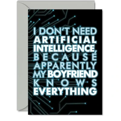 MAKE YOUR BOYFRIEND SMILE WITH THIS UNIQUE BIRTHDAY CARD: This exceptional quality Boyfriend birthday card shows the design 'I don?t need artificial intelligence because apparently my Boyfriend knows everything'. If you are looking for an awesome birthday card for Boyfriend, then then this happy birthday Boyfriend card is bound to make them smile. Not just a birthday card for Boyfriend this could also be a birthday gifts for Boyfriend, Partner or Companion. WHAT DO YOU GET: The cards are printed on both sides with the inside print saying 'Have an Algorithmic All Knowingly Awesome Day' and ample space for your own personal message. The unique fun design is printed on a specially sourced and environmentally responsible board. At 360 microns thick the natural white one-sided gloss board has a quality look and feel. Supplied with a coloured gummed envelope to complement the design and ready to be sealed and sent in the post. NO INK SMUDGES: There is nothing worse than writing inside a card to find that the shiny surface makes the ink smudge. This is why we use a high quality one sided coated board. The uncoated side will absorb more of the ink from your pen to make smudging a thing of the past. Boyfriend birthday cards, Boyfriend birthday cards from Girlfriend. SIZES: Greeting Card = 127mm x 178mm, Envelope = 130mm x 180mm, Card Thickness = 360 micron. Happy birthday Boyfriend, Boyfriends birthday card, Boyfriend cards birthday, birthday card Boyfriend, happy birthday Boyfriend card, Boyfriend gifts from Girlfriend. MADE AND QUALITY CHECKED IN THE UK: We print and manufacture all our products right here in the UK so you can be sure of a fast turnaround and a product that is expertly made. Using environmentally responsible premium board our card is conscious of the responsible management of the world's forests - happy birthday card Boyfriend, Boyfriend birthday cards.