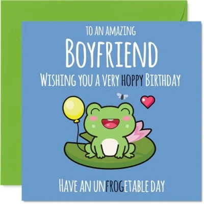 MAKE YOUR BOYFRIEND SMILE WITH THIS UNIQUE BIRTHDAY CARD: This exceptional quality Boyfriend birthday card shows the design 'To an amazing Boyfriend Wishing you a very hoppy birthday. Have an unfrogetable day'. If you are looking for a beautiful birthday card Boyfriend, then then this happy birthday Boyfriend card is bound to make them smile. Not just a birthday card for Boyfriend this could also be a birthday gifts for Boyfriend, Partner or Companion. WHAT DO YOU GET: The card is printed on one side and BLANK ON THE INSIDE to allow you to write your very own message. The unique fun design is printed on a specially sourced and environmentally responsible board. At 360 microns thick the natural white one-sided gloss board has a quality look and feel. Supplied with a coloured gummed envelope to complement the design and ready to be sealed and sent in the post. Boyfriend Anniversary cards, Partner birthday cards, Companion birthday card. NO INK SMUDGES: There is nothing worse than writing inside a card to find that the shiny surface makes the ink smudge. This is why we use a high quality one sided coated board. The uncoated side will absorb more of the ink from your pen to make smudging a thing of the past. Boyfriend birthday cards, Boyfriend birthday cards from Girlfriend. SIZES: Greeting Card = 145mm x 145mm, Envelope = 155mm x 155mm, Card Thickness = 360 micron. Happy birthday Boyfriend, Boyfriends birthday card, Boyfriend cards birthday, birthday card Boyfriend, happy birthday Boyfriend card, Boyfriend gifts from Girlfriend. MADE AND QUALITY CHECKED IN THE UK: We print and manufacture all our products right here in the UK so you can be sure of a fast turnaround and a product that is expertly made. Using environmentally responsible premium board our card is conscious of the responsible management of the world's forests - happy birthday card Boyfriend, Boyfriend birthday cards.