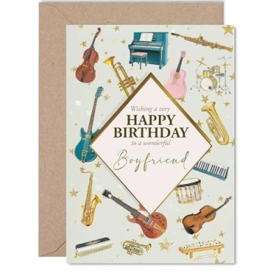 MAKE YOUR BOYFRIEND SMILE WITH THIS UNIQUE BIRTHDAY CARD: This exceptional quality Boyfriend birthday card shows the design 'Wishing a very Happy Birthday to a wonderful Boyfriend'. If you are looking for an awesome birthday card for Boyfriend, then then this happy birthday Boyfriend card is bound to make them smile. Not just a birthday card for Boyfriend this could also be a birthday gifts for Boyfriend, Partner or Companion. WHAT DO YOU GET: The cards are printed on both sides with the inside print saying 'Have a marvelously musical day' and ample space for your own personal message. The unique fun design is printed on a specially sourced and environmentally responsible board. At 360 microns thick the natural white one-sided gloss board has a quality look and feel. Supplied with a coloured gummed envelope to complement the design and ready to be sealed and sent in the post. NO INK SMUDGES: There is nothing worse than writing inside a card to find that the shiny surface makes the ink smudge. This is why we use a high quality one sided coated board. The uncoated side will absorb more of the ink from your pen to make smudging a thing of the past. Boyfriend birthday cards, Boyfriend birthday cards from Girlfriend. SIZES: Greeting Card = 127mm x 178mm, Envelope = 130mm x 180mm, Card Thickness = 360 micron. Happy birthday Boyfriend, Boyfriends birthday card, Boyfriend cards birthday, birthday card Boyfriend, happy birthday Boyfriend card, Boyfriend gifts from Girlfriend. MADE AND QUALITY CHECKED IN THE UK: We print and manufacture all our products right here in the UK so you can be sure of a fast turnaround and a product that is expertly made. Using environmentally responsible premium board our card is conscious of the responsible management of the world's forests - happy birthday card Boyfriend, Boyfriend birthday cards.