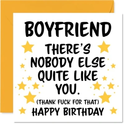 MAKE YOUR BOYFRIEND SMILE WITH THIS UNIQUE BIRTHDAY CARD: This exceptional quality Boyfriend birthday card shows the design 'Boyfriend Theres nobody else quite like you. (Thank fuck for that) Happy Birthday'. If you are looking for an awesome birthday card for Boyfriend, then then this happy birthday Boyfriend card is bound to make them smile. Not just a birthday card for Boyfriend this could also be a birthday gifts for Boyfriend, Partner or Companion. WHAT DO YOU GET: The card is printed on one side and BLANK ON THE INSIDE to allow you to write your very own message. The unique fun design is printed on a specially sourced and environmentally responsible board. At 360 microns thick the natural white one-sided gloss board has a quality look and feel. Supplied with a coloured gummed envelope to complement the design and ready to be sealed and sent in the post. Great Boyfriend birthday cards, Partner birthday card. NO INK SMUDGES: There is nothing worse than writing inside a card to find that the shiny surface makes the ink smudge. This is why we use a high quality one sided coated board. The uncoated side will absorb more of the ink from your pen to make smudging a thing of the past. Boyfriend birthday cards, Boyfriend birthday cards from Girlfriend. SIZES: Greeting Card = 145mm x 145mm, Envelope = 155mm x 155mm, Card Thickness = 360 micron. Happy birthday Boyfriend, Boyfriends birthday card, Boyfriend cards birthday, birthday card Boyfriend, happy birthday Boyfriend card, Boyfriend gifts from Girlfriend. MADE AND QUALITY CHECKED IN THE UK: We print and manufacture all our products right here in the UK so you can be sure of a fast turnaround and a product that is expertly made. Using environmentally responsible premium board our card is conscious of the responsible management of the world's forests - happy birthday card Boyfriend, Boyfriend birthday cards.