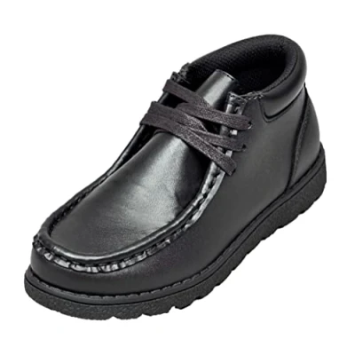 SMART HIGH-TOP DESIGN – Sleek matt black school shoes with a modern high-top profile that provides added ankle support and a fashionable look for everyday school wear LACE-UP FASTENING FOR SECURE FIT – Classic lace-up closure helps ensure a snug, adjustable fit for growing feet, promoting stability during active school days STURDY NON-SLIP SOLE – Thick, textured sole offers reliable grip and durability, making these shoes perfect for both indoor and outdoor school environments ALL-DAY COMFORT – Designed with a soft padded ankle collar and cushioned insoles to provide superior comfort and support throughout the day EASY CARE SYNTHETIC MATERIALS – Made with synthetic uppers, lining, and soles for long-lasting wear and easy maintenance—just wipe clean after use