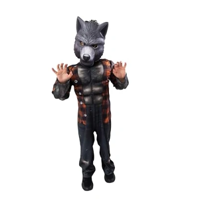 Includes one-piece printed werewolf jumpsuit with muscle chest and realistic werewolf Eva digi print face mask Fierce werewolf design with printed fur and torn clothing Built-in padded muscle chest for a powerful monster look Separate detailed wolf mask adds to the realism Ideal for Halloween, dress-up, and themed parties