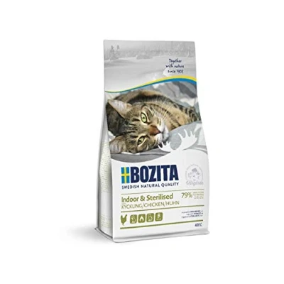 Specially developed for domestic cats and sterilised cats: high-quality dry food with 32% protein and 14% fat - tailored to the needs of sterilised adult cats. Supports weight control & vitality With delicious chicken - particularly digestible: the high proportion of chicken makes the cat dry food easy to digest and ensures the best taste - ideal for demanding or sensitive cats No sugar & artificial additives: Bozita Indoor & Sterilised cat food is free from artificial colours, flavours and preservatives - for a natural and healthy diet for your cat GMO-free and environmentally conscious: the Swedish premium feed is made resource-saving from GMO-free ingredients - quality and sustainability you can rely on Practical 400g pack - Complete food for every day: wheat dry food for adult cats, ideal for daily feeding. Store in a dry and cool place for best freshness