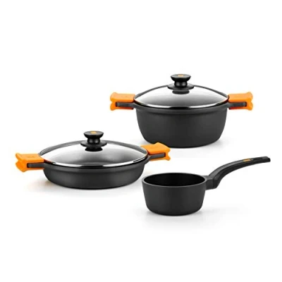 3-piece kitchen set made from highly durable cast aluminium with PFOA-free non-stick coating Uniform maximum efficiency diffuser base (Save energy system) Removable heatproof silicon handles included Suitable for all hob types, including induction. The 3-piece bra efficient battery consists of: High 24 cm pan with lid-4 liters (base diameter 16.9 cm)/cacerola low 28 cm with lid-3.1 liters (base diameter 21 cm)/saucepan 16 cm (base diameter 11.8 cm) Its high-quality PFOA-free non-stick coating makes cooking extremely easy, ensuring that food won't stick, and makes cleaning an almost effortless process. Dishwasher safe Product Amazon Exclusive
