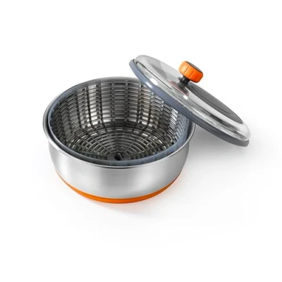 STAINLESS STEEL: Salad spinner for double use as a bowl, made of top quality 18/10 stainless steel CAPACITY: has a capacity of 4L CONSISTS: Stainless steel bowl with non-slip base, removable grid basket, bottom centering accessory for basket, transparent plastic lid with silicone knob LID: Transparent lid with orange knob with great ease of turning to drain water quickly and effortlessly DUAL USE: Bowl suitable for use as a bowl for serving food to the table and for food preservation container.