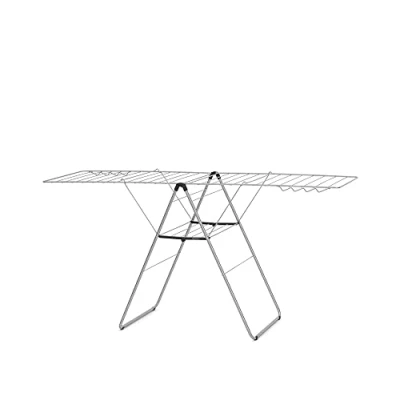 Can hold up to two machine loads of laundry - 25 metres drying space For laundry items big and small - adjustable wing height Space saving – compact size when folded and easy to set up Perfect for blouses and shirts - 8 hooks for hangers included Suitable for (flat) drying of delicate laundry – with drying platform