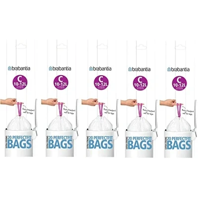 Amazon Marketplace5 x packs Brabantia Pack of 20 bags (100 in total) Extra Strong Perfect C Size 10-12L Waste bin bags suitable for 10l-12l high touch and pedal bins. Made from wear-resistant plastic