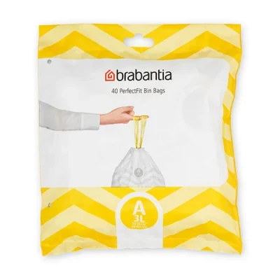Brabantia PerfectFit bin bags are perfectly tailored to fit your Brabantia waste bin, and made to make life easier.That's why they are extra strong, come in a convenient dispenser pack, and have a handy tie-tape too!Just pull it to remove the bag from the bin and seal it. Not certain of which size you need? Simply check the colour code on the inside of your waste bin lid.Great bin bags, perfectly fitting your Brabantia bin.Made of extra strong plastic, these bin nags are tear resistant. Thanks to the special ventilation holes to prevent vacuum, Brabantia PerfectFit Bags promote hassle free changing.Pack of 40 bags to perfectly fit your 3L Brabantia Bin (code A).