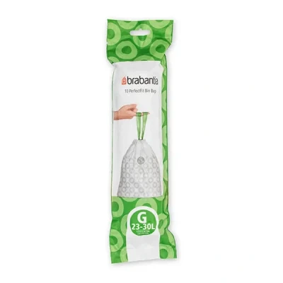 Harts of SturBrabantia PerfectFit bin bags are perfectly tailored to fit your Brabantia waste bin, and made to make life easier.That's why they are extra strong, come in a convenient dispenser pack, and have a handy tie-tape too!Just pull it to remove the bag from the bin and seal it. Not certain of which size you need? Simply check the colour code on the inside of your waste bin lid.Great bin bags, perfectly fitting your Brabantia bin.Made of extra strong plastic, these bin nags are tear resistant. Thanks to the special ventilation holes to prevent vacuum, Brabantia PerfectFit Bags promote hassle free changing.Pack of 10 bags to perfectly fit your 23-30L Brabantia Bin (code G).
