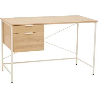 General description The Bradbury desk is ideal for both commercial and home office environments. It features a rectangular natural oak effect wooden top that rests on a subtly industrial-style white metal frame. With two drawers, this desk helps maintain a tidy workspace, making it perfect for office and homeschooling needs. Technical specifications Material: Natural oak veneer top Frame: White metal Number of drawers: 2