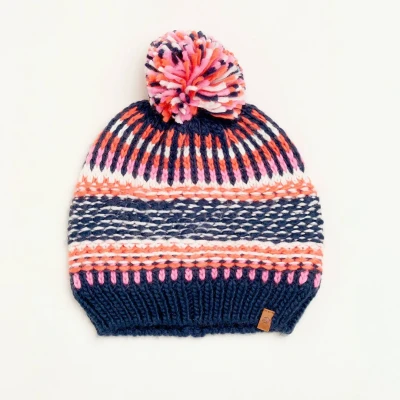 The Brakeburn Textured Stripe Knitted Hat adds a unique flair to your autumnal outfit. It has a unique, colourful design in intertwining shades of pink, white, coral and navy, with a solid navy ribbed hem and a fun pom pom on the top.The Brakeburn brand can be found on the hem.Made from 100% acrylicCold wash separately