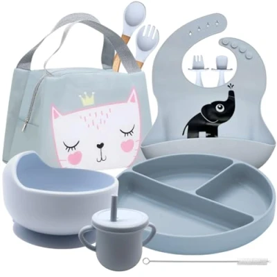 All in one Baby Feeding Set: Empower self feeding with our set which features a adjustable bib, 1 suction-based bowl, 3-portion suction plate, 1 straw cup with brush, 1 wooden spoon & fork, 1 small silicone spoon & fork, and portable lunch bag. Travel Lunch Bag: Perfect for picnics and trips, this stylish, easy-to-clean lunch bag securely stores your baby's essentials. Made from non-toxic materials, it’s foldable, thermal, and waterproof, keeping tableware safe and organized on the go Purely Safe Baby Utensils: Expertly Designed from Food-Grade Silicone, Free from BPA, PVC, Phthalates, and Lead. Soft, Edgeless Perfection for Gentle Gum Care. Utensils with a Built In Safety Guard for Your Peace of Mind Advanced Suction Power: Designed with a high suction base. Baby dinner sets stay firmly in place on high-chair trays, promoting stress free self-feeding. Say goodbye to food spills as your child won't be able to push, tip, or toss it Hassle Free Maintenance: Our baby weaning essentials are designed to endure temperatures from -40°C to 220°C, making them dishwasher and microwave safe. These utensils are stain-resistant & odorless. Transforming mealtime into a breeze, Manufacturer: Brancy