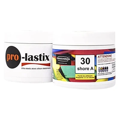 Product description - Pro-lastix 30 is a liquid silicone elastomer that cures cold by catalyst, resulting in an elastic compound, a stable rubber without shrinkage. It is supplied in two component packages: base A and hardener B to mix before use. There are many areas of use: prototypes and small series of articles in the automotive industry, medical, sports equipment, accessories, seals, elastic joints, pneumatic tyres HOW TO USE - The mixture you get has a useful life of about 60 minutes. The apparent viscosity of the product does not affect its smoothness, in fact it manages to reach all the details of the surface to be coated. Neutral colour, but pigmentable with PENTASOL sil. Pro-lastix can be driven into silicone rubbers by addition. Great for making synthetic faux leather for tattoo practice or fake hand for nail reconstruction Technical specifications - It is produced in 4 different hardnesses 10-20-30-40-50 shore depending on the needs of elasticity. Keep the product after each use in the original container and store in a dry place PROCHIMA - Since 1962 it has been a leader in Italy in the field of resins and composite materials. The high quality standards achieved are today confirmed by the adoption of a total quality system certified according to the recent regulations. The value and pride of Prochima, a reason for continuity over the years since its foundation, is to put knowledge of the uses of resin available to all CUSTOMER SERVICE - Our main goals are maximum customer satisfaction and be a reliable partner even after product delivery. Our support service will be available to customers to solve any problem and to clarify any doubts, Manufacturer: Prochima