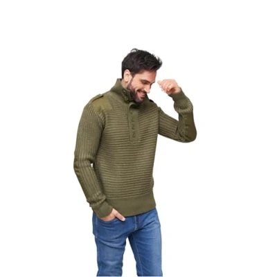 Comfortable long sleeve jumper Design based on the Austrian Alpine Army sweater Wide knitted cuffs and hem. High collar with button placket Epaulettes with hook-and-loop. Reinforced elbows and shoulders Material: 100% Acrylic. Material 2: 100% Cotton