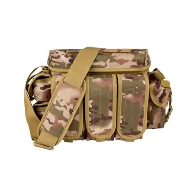Multifunctional bag made of 600D polyester 1 large main compartment, practical quick access via pocket lid, Velcro fastener 3 front patch pockets with Velcro fastener 3 small side pockets with Velcro closure and additional clip closure Length-adjustable shoulder strap with padded shoulder rest, Molle system, adjustable compression strap