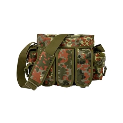 Multifunctional bag made of 600D polyester 1 large main compartment, practical quick access via pocket lid, Velcro fastener 3 front patch pockets with Velcro fastener 3 small side pockets with Velcro closure and additional clip closure Length-adjustable shoulder strap with padded shoulder rest, Molle system, adjustable compression strap