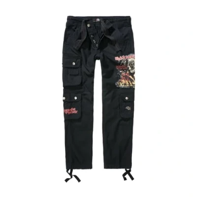 Large multi-coloured Iron Maiden print on the left leg logo buttons - "Number of the Beast" print on right leg pocket Stylish slim fit cargo trousers - slim fit - robust, skin-friendly cotton material - adjustable waist circumference with drawstring Removable Iron Maiden Eddie metal pin - Iron Maiden faux leather belt loop at the back High-quality button placket, 2 side pockets, 4 practical cargo pockets with press stud closure, 2 back pockets, sturdy belt loops Fashionable print on a cargo pocket