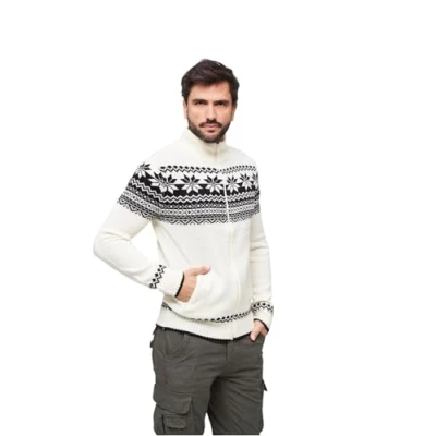 Warm knitted cardigan Classic, straight cut Scandinavian design. High collar with soft fleece Full front zipper. Knitted cuffs and hem. Two side pockets with zipper Material: 100% Acrylic