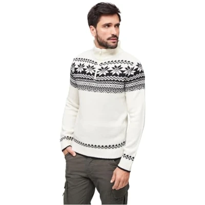 Warm knitted jumper Classic, straight cut Scandinavian design. High, zipped collar Soft fleece inside collar. Knitted cuffs and hem Material: 100% Acrylic