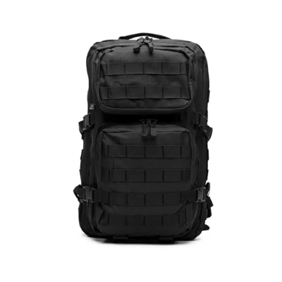 Rear hook-and-loop pocket for a hydro pack. All main pockets with a two-way zipper. Adjustable padded shoulder straps Adjustable and removable hip belt. Generously padded back. Lateral compression straps Various MOLLE attachment points. Loops and D-Rings on shoulder straps. Strong carry handle on top Material: 100% Polyester, PVC coated. External dimensions: 17.7"x9.4"x10.2" (45x24x26cm). Weight: 1010g