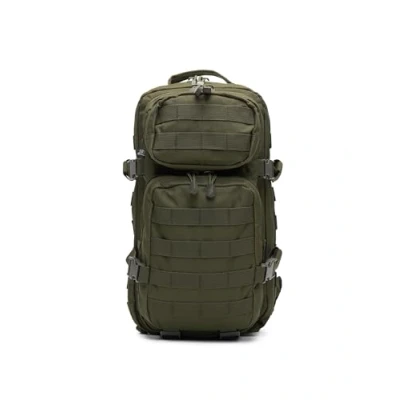 Rear hook-and-loop pocket for a hydro pack. All main pockets with a two-way zipper. Adjustable padded shoulder straps Adjustable and removable hip belt. Generously padded back. Lateral compression straps Various MOLLE attachment points. Loops and D-Rings on shoulder straps. Strong carry handle on top Material: 100% Polyester, PVC coated. External dimensions: 17.7\