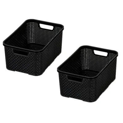 Set of 2 baskets made of high-quality plastic in rattan design in size L Rattan design with small ventilation holes. Ideal for the bathroom, kitchen, workshop or office. For the production of our products, we only use high-quality BPA-free plastics from the EU Material: BPA-free plastic PP, dimensions: 38 x 27.8 x 18.5 cm (L x W x H) Colours: black, quantity: 2 pieces