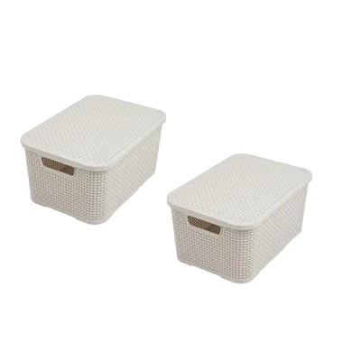 Set of 2 High Quality Large Rattan Design Plastic Lid Baskets Stackable and sturdy. Ideal for the bathroom, kitchen, workshop or office Material PP plastic, dimensions 38 x 27.8 x 18.5 cm (L x W x H) For the manufacture of our products, we only use high-quality BPA-free plastics from the EU Color cream, quantity 2 pieces