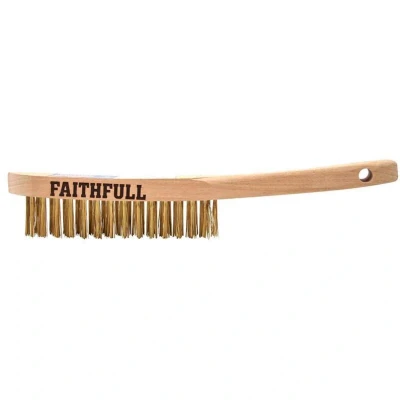 General description The Faithfull Brass Scratch Brush features three rows of brass wire bristles, making it ideal for preparatory work such as removing rust, scale, old paintwork, and grouting. The brass wire is spark-free, which is particularly useful in fire or explosion-prone environments. The handle is crafted from durable FSC-certified beech wood, designed for easy storage and access with a drilled hole for hanging. Other information FSC-certified wood ensures sustainable and responsibly sourced materials.