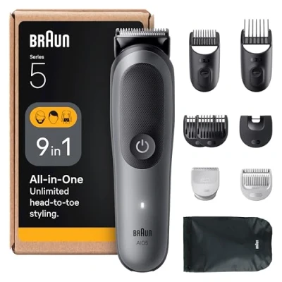 Unlimited head-to-toe styling: Braun’s 9in1 kit for All-in-One grooming includes curated tools for beard trimming, hair clipping and manscaping Advanced versatility: The Ultra Sharp Blade brings precision, efficiency and comfort to grooming your whole body with a one blade tool Gentle on sensitive skin: Groom with SkinGuard technology, designed for maximum safety and comfort even on sensitive body areas Always in control: Beard trimmer includes 14 lengths (3–21 mm) for great grooming results Built to last: 100 percent waterproof with AquaGrip for control even under the shower, Long-lasting Li-Ion battery for up to 120-min cordless runtime