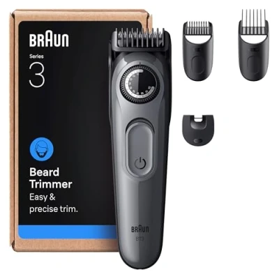 Easy & precise trim: Braun’s Beard Trimmer, Series 3, gives effortless style control at your fingertips Great results every stroke: The Ultra Sharp Blade helps you catch even tricky hairs and trim your beard evenly and efficiently Effortless style control: Stay in full control with every trim thanks to PrecisionWheel and 40 length settings in steps of 0.5 mm High-quality styling tools: Trim and edge with styling tools designed to achieve great lines and even finishes Ready to use: Trimmer for men with 50-min cordless runtime