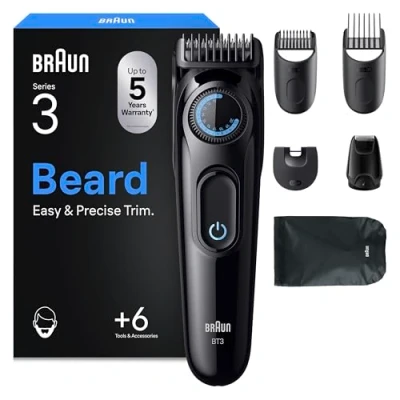 Easy & precise trim: Braun’s Beard Trimmer, Series 3, gives effortless style control at your fingertips Great results every stroke: The Ultra Sharp Blade helps you catch even tricky hairs and trim your beard evenly and efficiently Effortless style control: Stay in full control with every trim thanks to PrecisionWheel and 40 length settings in steps of 0.5 mm High-quality styling tools: Trim, edge and detail with styling tools designed to achieve great lines and even finishes Ready to use: Trimmer for men with 50-min cordless runtime