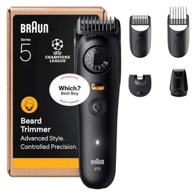 Braun Beard Trimmer Series 5, +5 Styling Tools, Ultra Sharp Blade, 120 Min Runtime, 40 Lengths, Waterproof, PrecisionWheel & Lock, BT5525, Grey