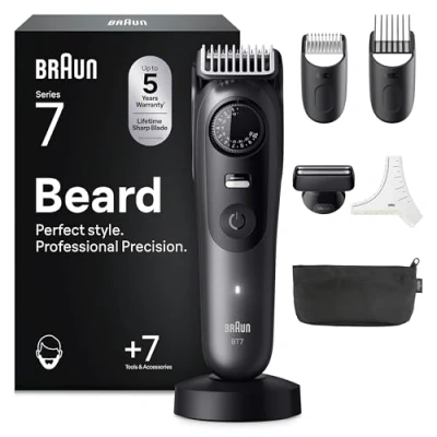 Perfect style & professional precision: Braun’s Beard Trimmer, Series 7, gives flawless style control at your fingertips Maximum efficiency: Catch even tricky hairs with the lifetime ultra sharp ProBlade and achieve perfect evenness for any beard thanks to AutoSense Technology No more mistakes: Stay in full control with every trim thanks to PrecisionLock and PrecisionWheel with 40 length settings in steps of 0.5 mm Premium barbering tools: Trim, shave, and edge with the best trimming tools for smooth fades and even finishes. Get perfect lines with the PrecisionShave head Built to last: 100% waterproof trimmer for men with long-lasting Li-Ion battery and up to 120-min cordless runtime