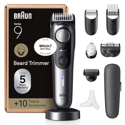 Professional precision & 100% control: Braun’s Best Beard Trimmer, Series 9, lets you trim, shave, edge and detail with premium barbering tools for perfect lines, smooth fades and even finishes Maximum efficiency: Trim even the densest beards with PowerBoost extra mode and achieve perfect evenness on any beard thanks to AutoSense technology Perfect shave & trim every stroke: Trim even tricky hairs with the lifetime ultra sharp ProBlade and achieve perfect lines with PrecisionShave head No more mistakes: Stay in full control with every trim thanks to PrecisionLock and PrecisionWheel with 52 length settings in steps of 0.25 mm Built to last: 100% waterproof trimmer for men with long-lasting Li-Ion battery and up to 180-min cordless runtime