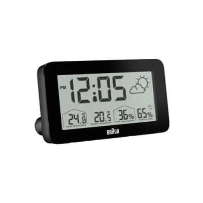 Braun Digital Weather Station Clock with Indoor and Outdoor Temperature Humidity, Forecast, LCD display, Quick set, Crescendo beep alarm in black, model BC13BP.