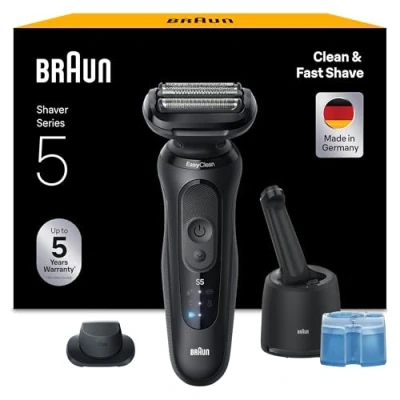 "Easy, Fast and Gentle Shave: The Braun Series 5 electric shaver delivers a quick, effortless shave designed to be gentle on skin, ideal for daily use and perfect for men seeking a smooth, irritation free finish Adaptive 3 Flex Blade System: Features 3 flexible blades that automatically adapt to the contours of your face for maximum skin contact and a closer, more comfortable shave, great for all beard types 2 Shaving Modes for Your Routine: Choose Turbo Mode for an ultra fast shave when you are in a rush, or Standard Mode for the perfect balance between speed and skin comfort, a versatile electric razor that adapts to your shave routine Complete Grooming Kit and Smart Cleaning: Includes a 4 in 1 SmartCare Center that cleans, lubricates, dries, and charges your shaver, removing up to 10 times more residue than water, plus an additional grooming attachment for trimming, edging, and styling Durable German Engineered Design: Built to last for years, fully waterproof for wet and dry shaving whether you use foam, gel, or shave in the shower, powered by a long lasting Li Ion battery with up to 50 minutes runtime and a 5 minute quick charge for one full shave, perfect for home or travel Great Gift for Him: A premium electric shaver for men, ideal for birthdays, holidays, Father’s Day, or any occasion when you want to give a high quality grooming gift"