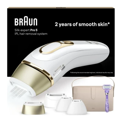 Braun IPL Silk Expert Pro 5, At Home Hair Removal Device with Pouch, White/Gold, PL5347