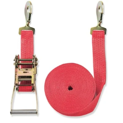 Lashing strap with high-quality ratchet and turned carabiner hooks Straps have reliable tractive force 5000 daN Tape width: 50 mm, Length 8 m Strap made of 100% polyester Colour Red German manufacture in accordance with DIN EN 12195-1