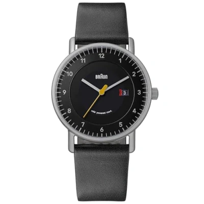 Braun mens 3-hand solar powered analogue watch with date display. 40 mm matt stainless steel case with solar powered quartz date movement and iconic yellow second hand. Scratch resistant mineral glass and snap case back. 5ATM water resistance. Black Leather strap. 2 year guarantee.