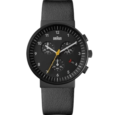 Braun mens chronograph with date analogue watch 40 mm matt black plated stainless steel case with quartz chronograph with date movement and iconic yellow chronograph hand Scratch resistant mineral glass and snap case back 5ATM water resistance Genuine leather strap 2 year guarantee